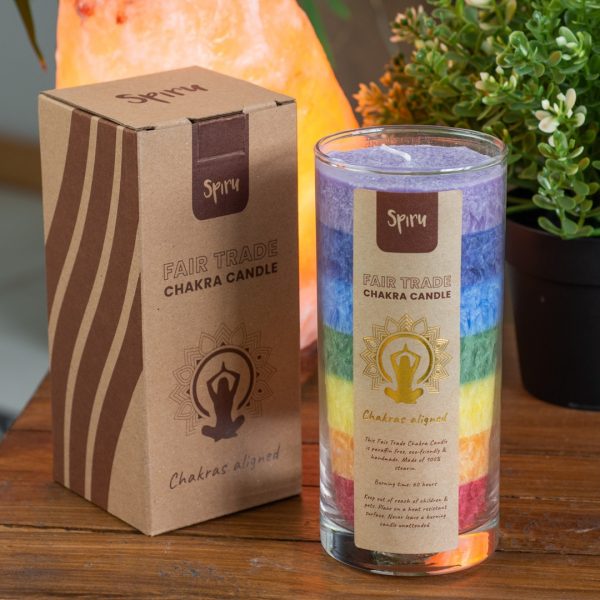This beautiful chakra stearin candle burns for 60 hours. It is made from recycled materials and is fragrance-free.