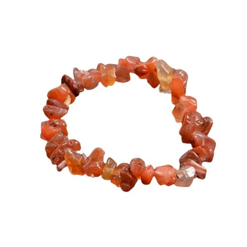 This Carnelian Crystal Chip Bracelet features pieces of carnelian chips, a naturally occurring semi-precious stone. Carnelian crystal is known for its healing and protective properties, and wearing it is said to stabilize energies and bring optimism and creativity. Each piece is unique and hand-crafted, perfect for adding a special touch to any outfit.