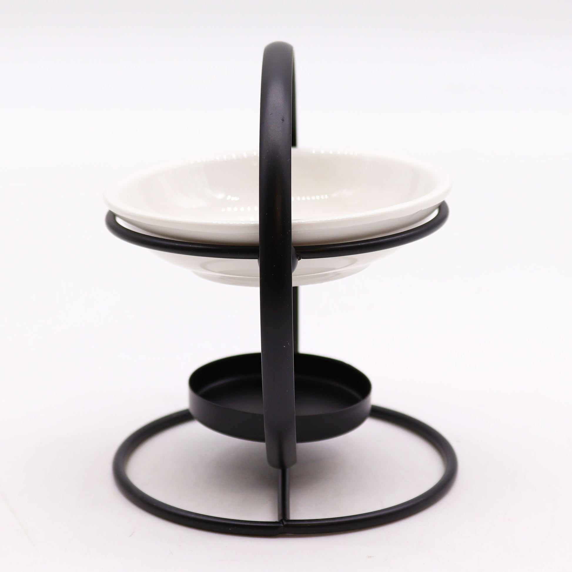 A round stand oil burner with a harmonious fusion of ceramic and metal, radiating a timeless charm in any setting.
