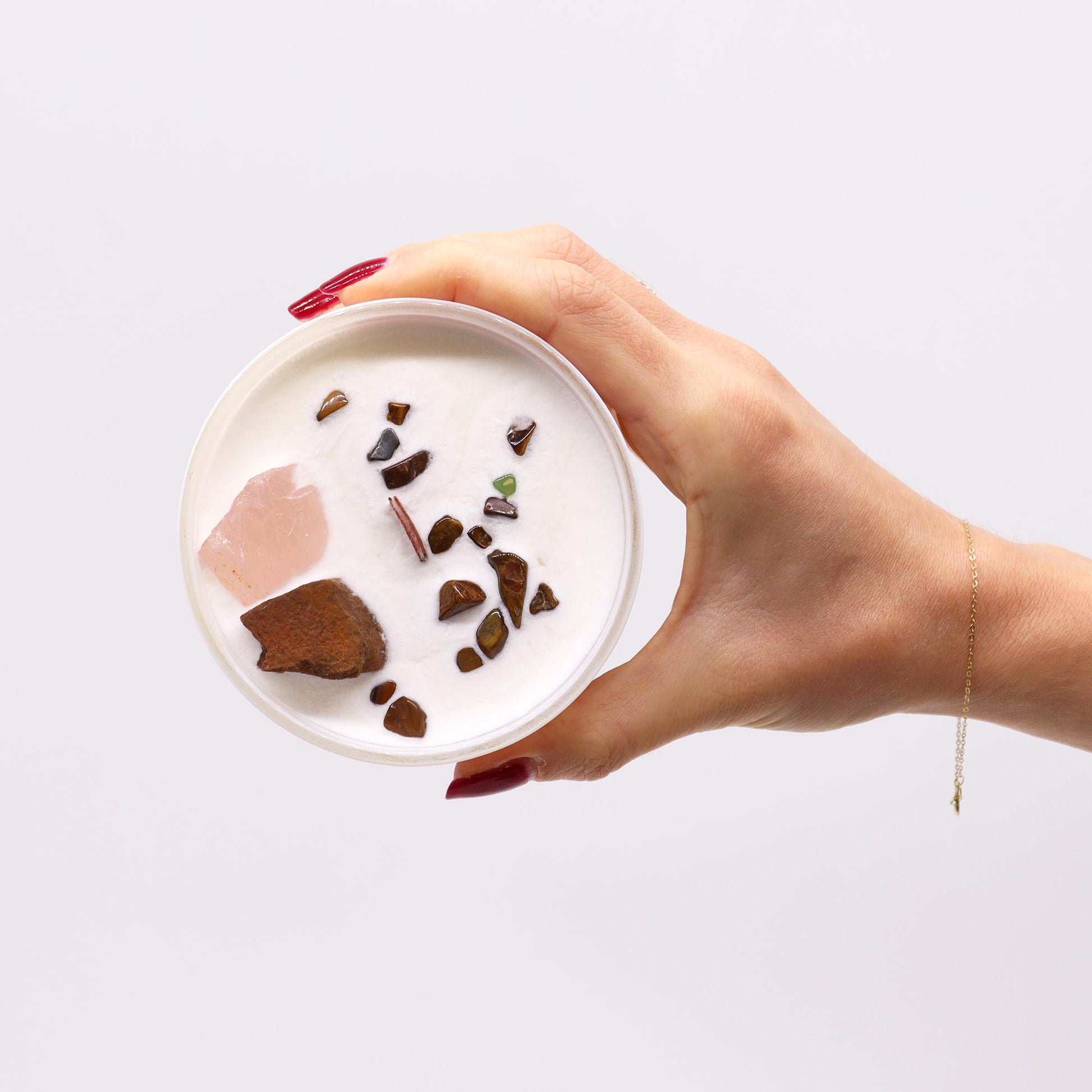 After burning this candle, the jar can be repurposed and you can clean and keep the rock crystals.