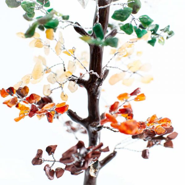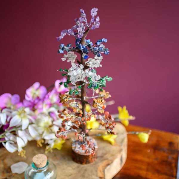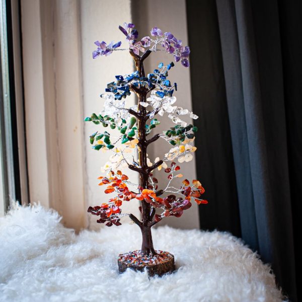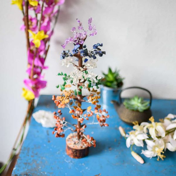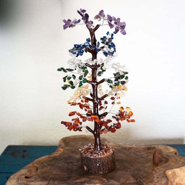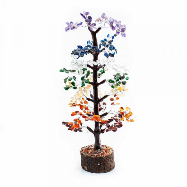 They are made with various types of gemstones, each with its own effect. This particular gemstone tree contains chakra gems.