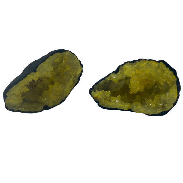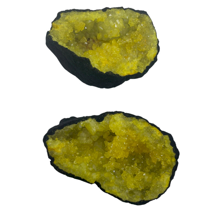 This beautiful artificially coloured Calcite Geode - Black Rock - Yellow, offers its colour once opened, the crystals which formed there are magnificent.