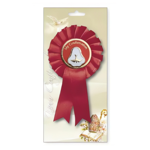 Honor the special occasion of Confirmation with this beautifully crafted Confirmation Rosette. Featuring a striking pearl dove medal and elegant red ribbon, this rosette is a meaningful accessory that celebrates faith and serves as a cherished keepsake of the day.