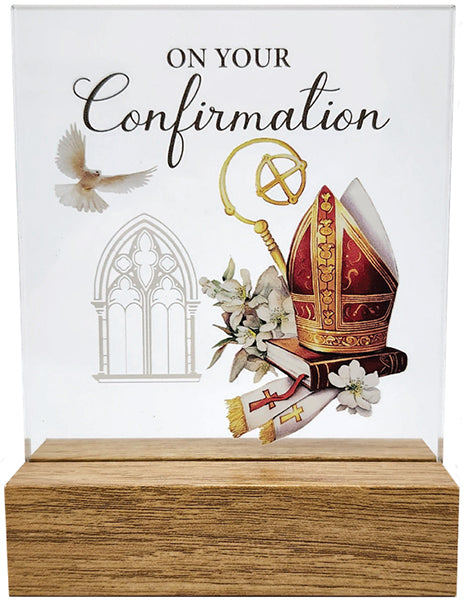 Celebrate the sacred milestone of Confirmation with this elegant Glass Plaque on a wooden base, designed to honor and commemorate this significant spiritual journey.