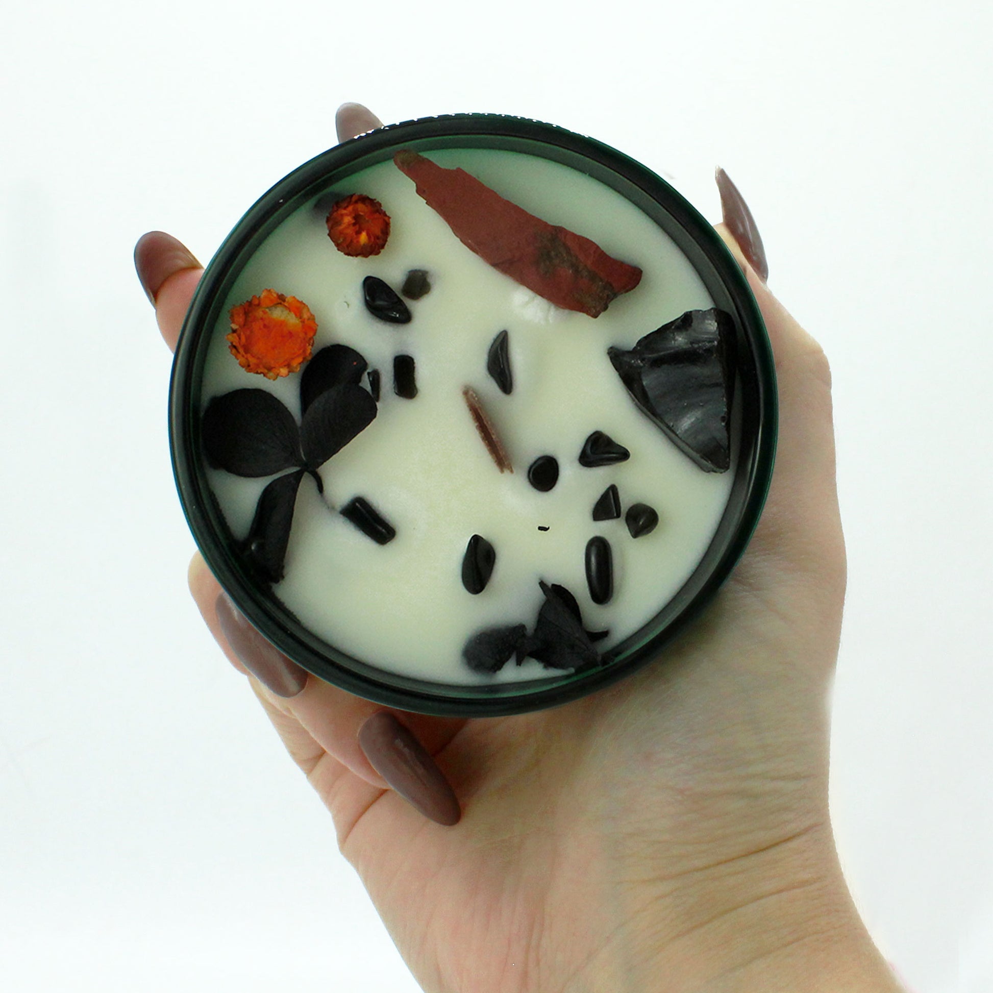 This candle features bold red jasper and black agate gemstones, embodying the fiery energy of passion. Red jasper, known for its grounding properties, combines with the protective energy of black agate to create a dynamic and empowering atmosphere. Light The Devil and embrace the passionate intensity it brings, turning your space into a haven for motivation and vibrancy.