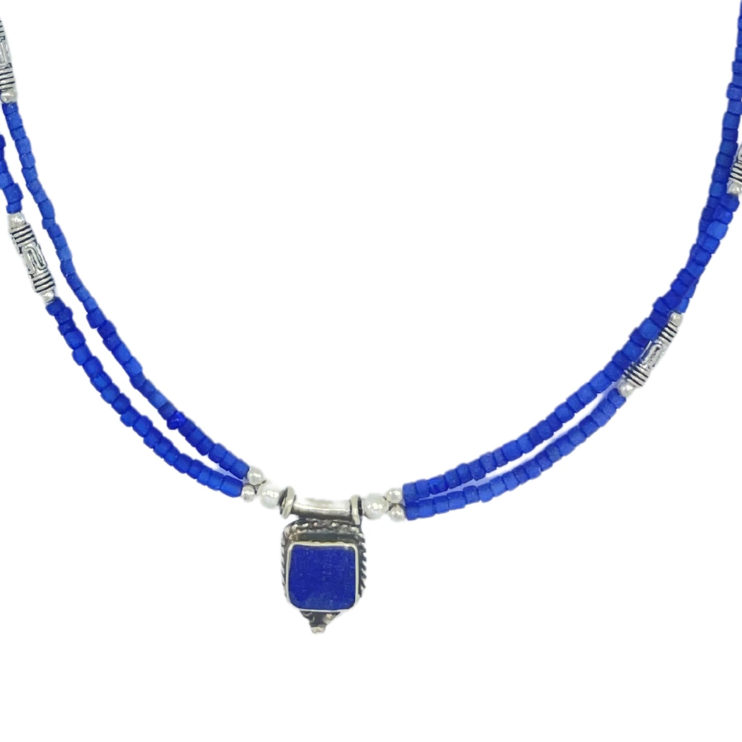 Nepalese Extra Fine Two Line Necklace - Blue Onyx & Lapis Pendant