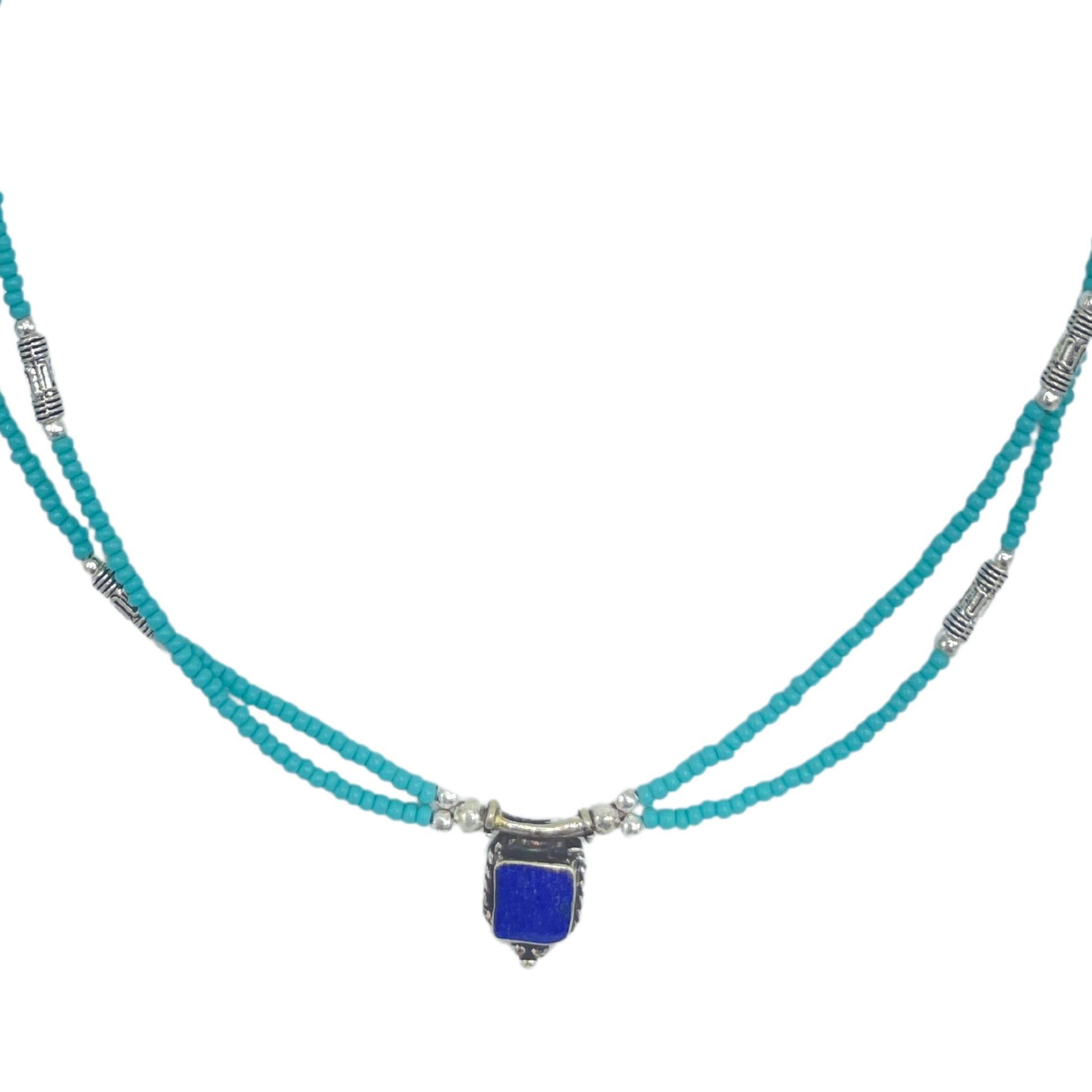 Nepalese Extra Fine Two Line Necklace - Turquoise & Lapis Pendant