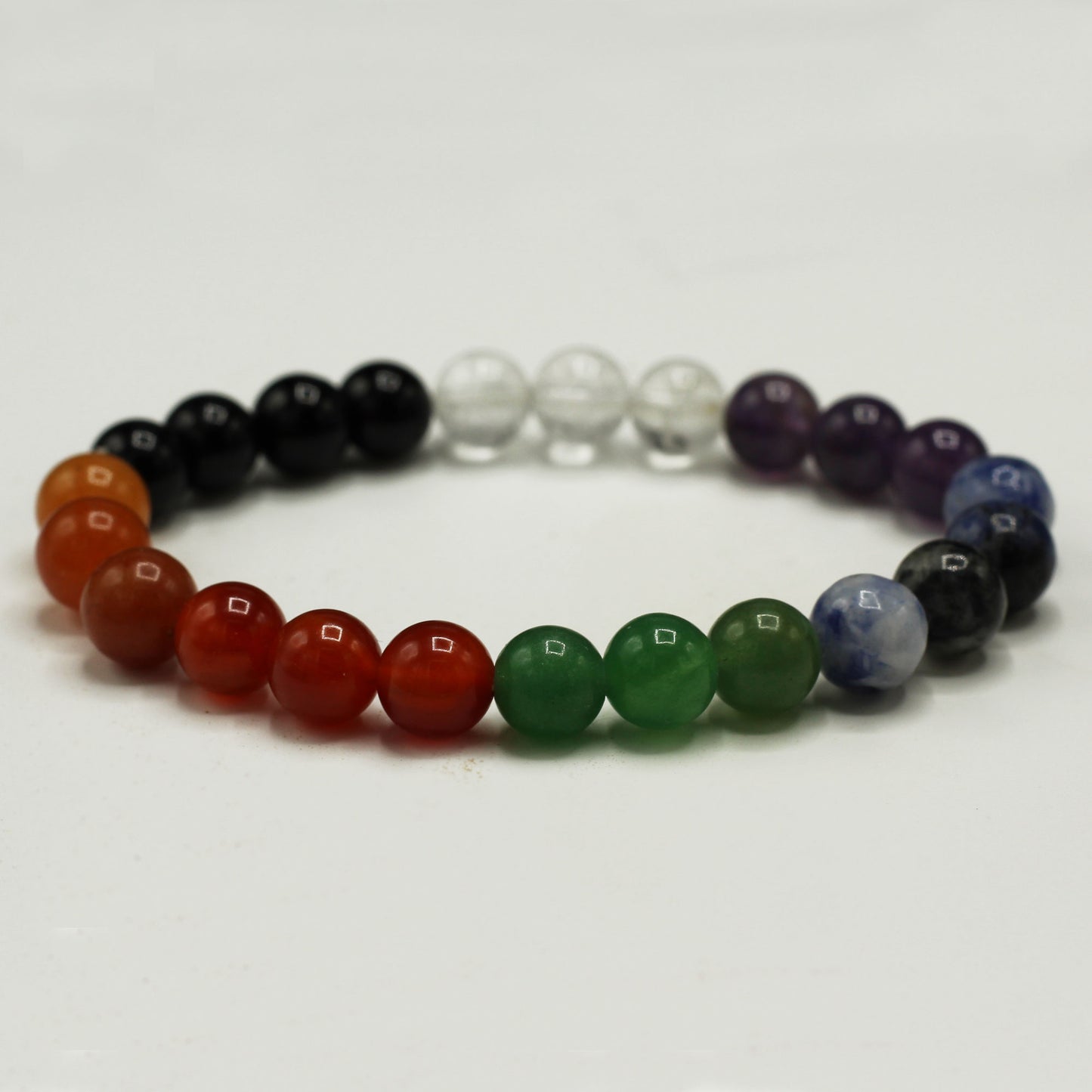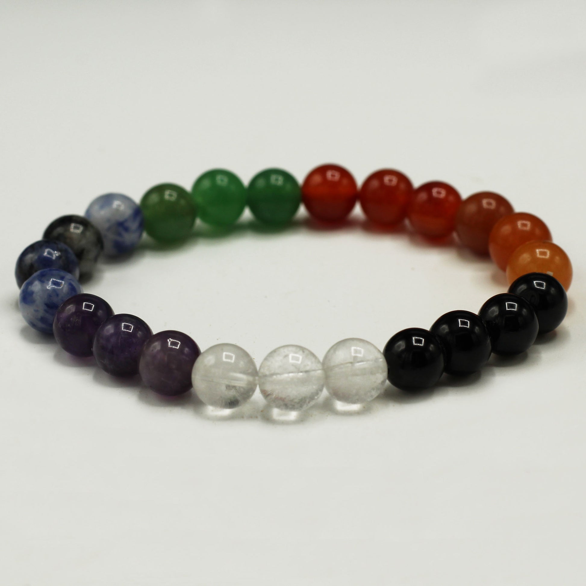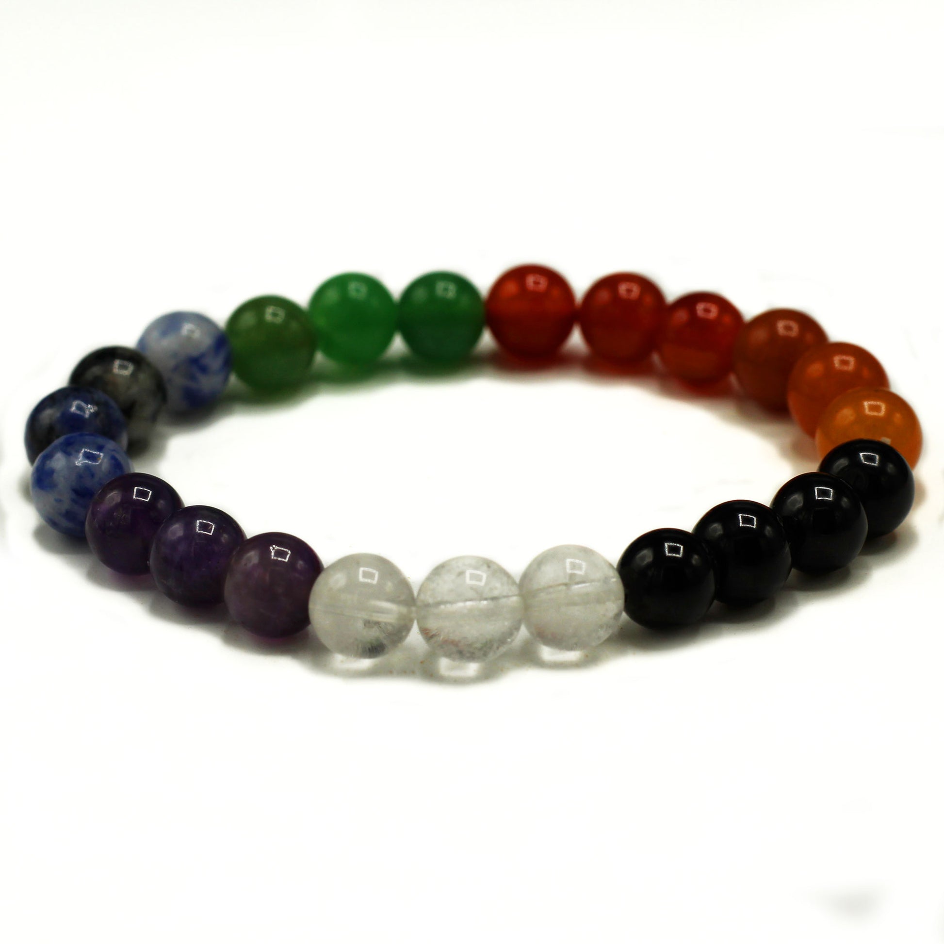 Harness the properties of the Chakra Stones, featuring Amethyst, Rock Quartz, Sodalite, Green Aventurine, Black Agate, Honey Crystal, and Carnelian. Each stone corresponds to the seven different chakras, bringing a unique set of energies and benefits.