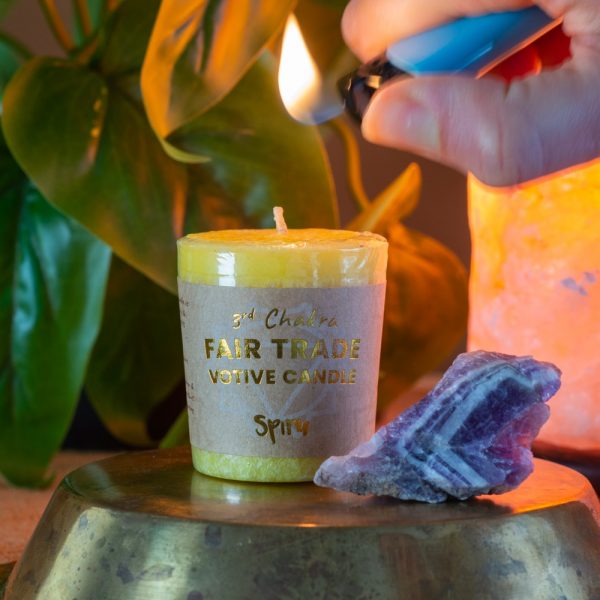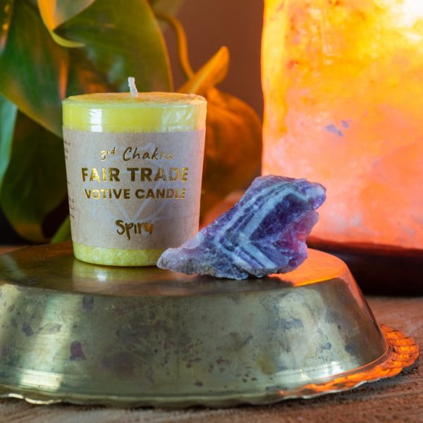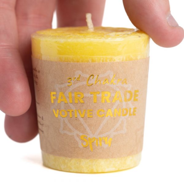 A traditional votive / wishing candle for the 3rd chakra. The Solar Plexus Chakra symbolizes self-worth and self-confidence, as well as in self-control. Light the candle and manifest / make a wish!