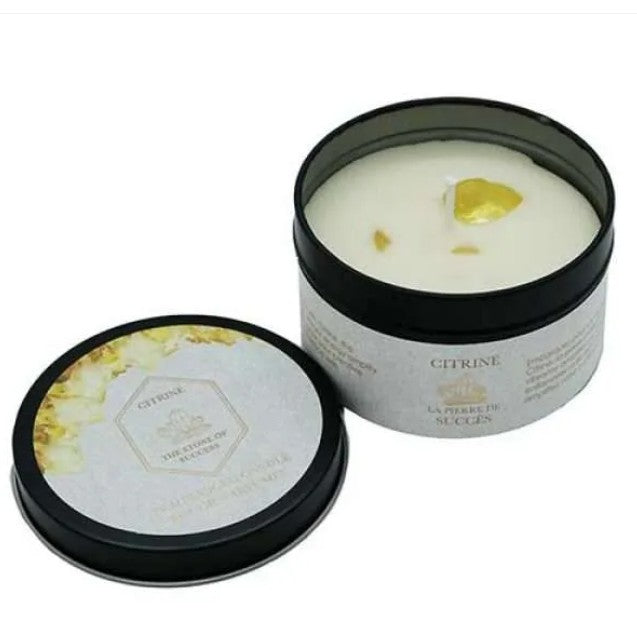 Embedded within the candle are genuine Yellow Citrine crystals, celebrated for their energizing properties: