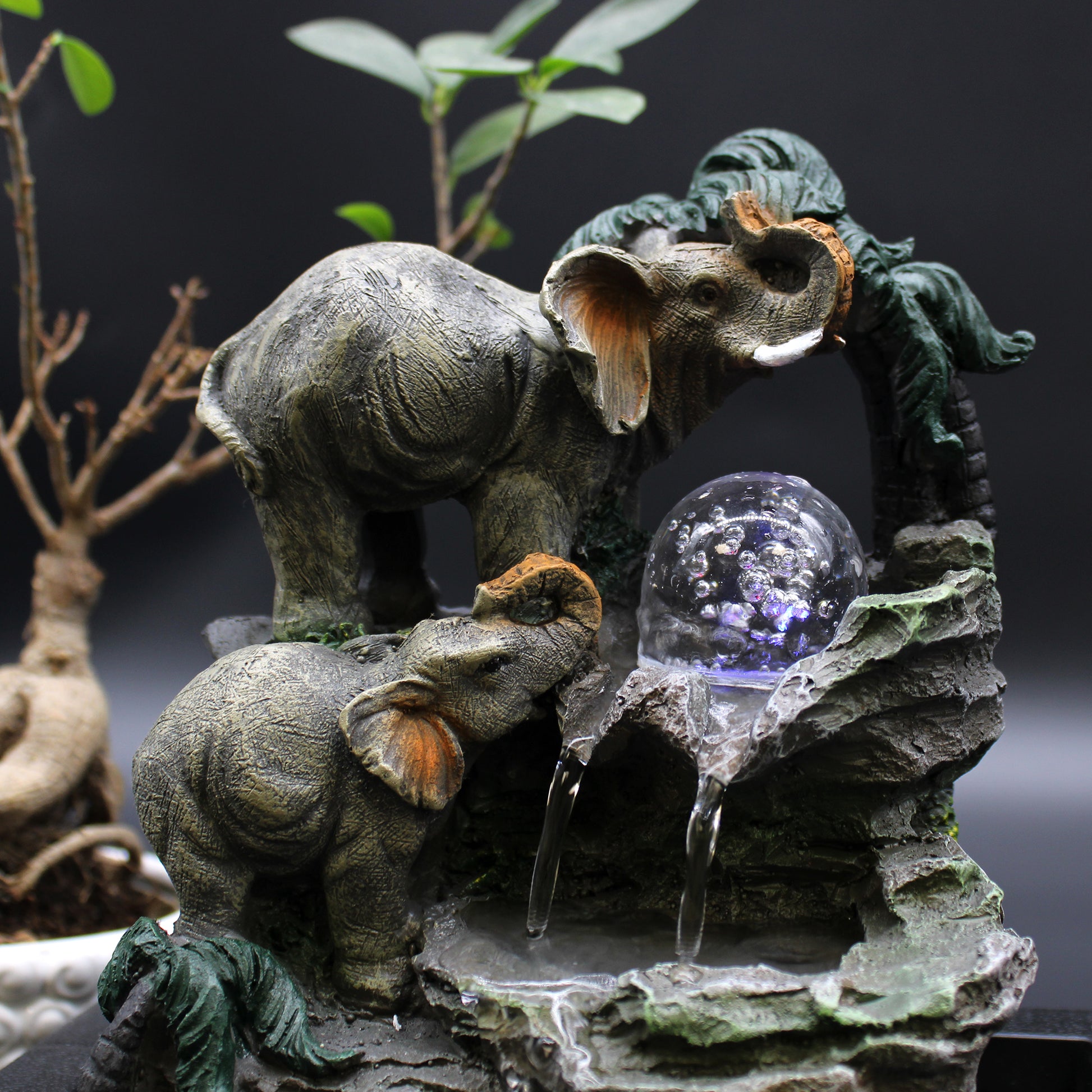 Bring a tropical vibe to your space with elephants under a palm tree, complemented by soothing water flow.