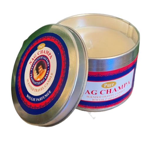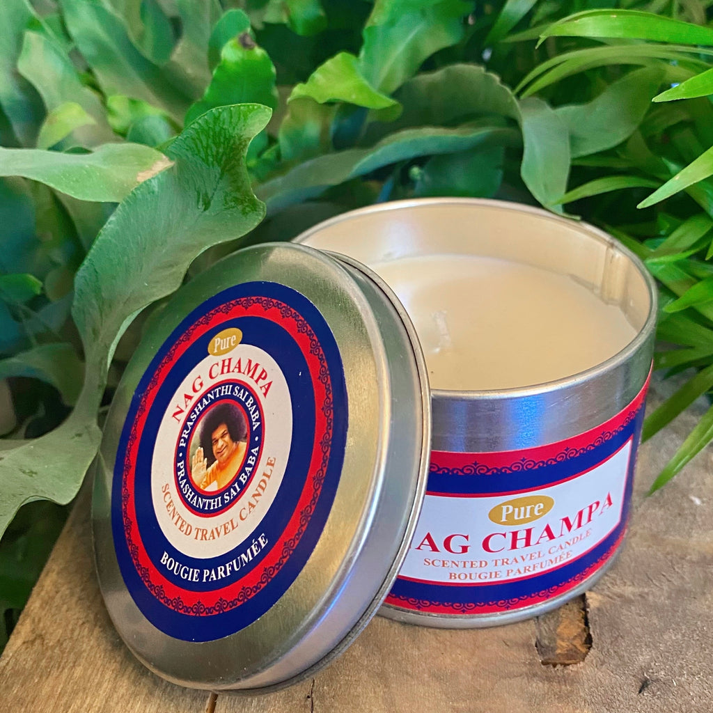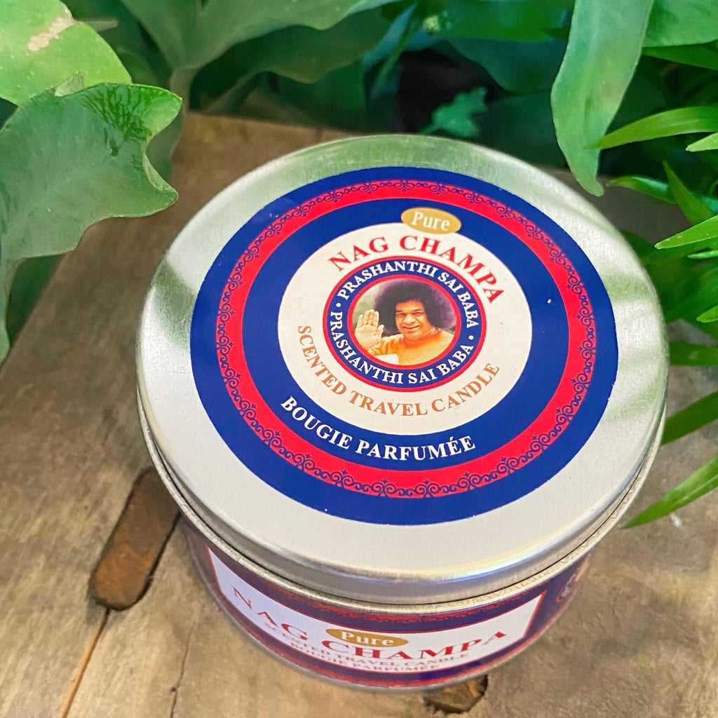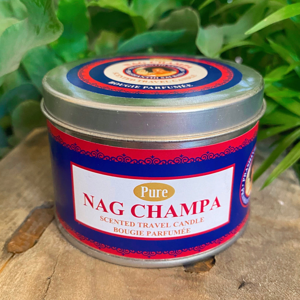 Light up the room with this Nag Champa Scented Candle. It is made with the famous Nag Champa Argabbati scent, perfect for those who cannot burn traditional incense. It comes in a convenient tin travel container, making it a great unique gift. Bring a cozy feeling anywhere!